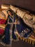 Maya is a heavenly shade of blue raw silk base, generously embroidered with gold tilla, gold sequins, and threads. The A-line long shirt is paired with culottes. The front features scalloped border details and a heavily embroidered neckline. A gorgeous motif is carefully placed on the back. The chiffon dupatta is composed using embroidered details of tilla, resham, and sequins.