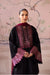 A premium dHANAK black farshi shalwar and shirt set, adorned with embroidery and sequin accents, paired with a chiffon dupatta finished with tassels on all four corners